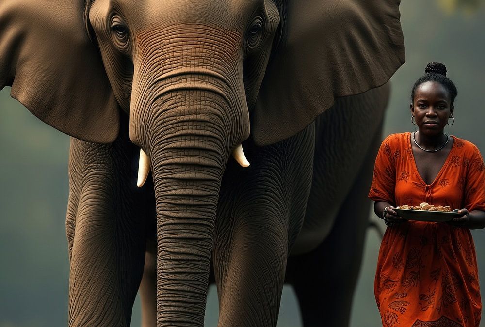 Une femme tenant une assiette se tient à côté d'un grand éléphant dans un cadre naturel en plein air. La scène est de couleur terre avec un arrière-plan de feuillage vert.