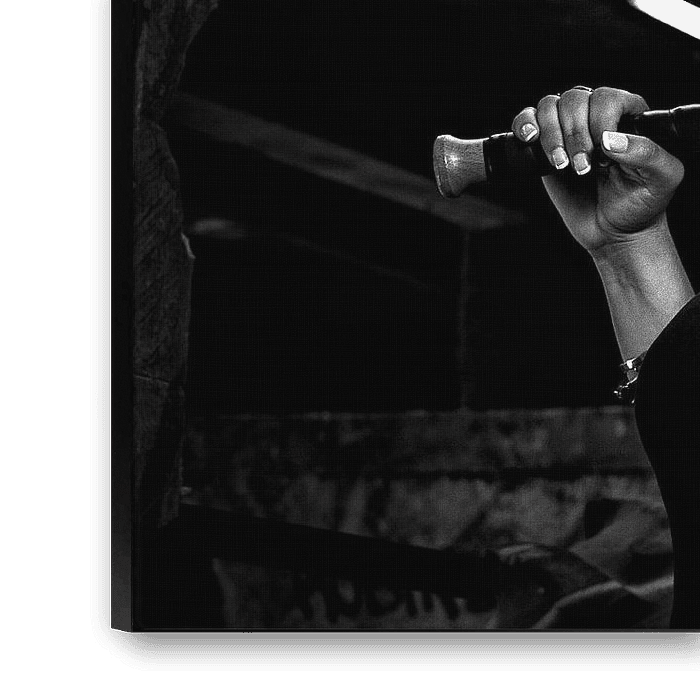 Cette photographie en noir et blanc montre une femme au regard intense et confiant. Elle se tient dans un environnement urbain brut, rempli de graffitis, évoquant une atmosphère de rébellion et de force. Dans sa main, elle tient nonchalamment une batte de base-ball portant l'inscription "Super Bat", ce qui lui confère une allure dangereuse et intrépide.