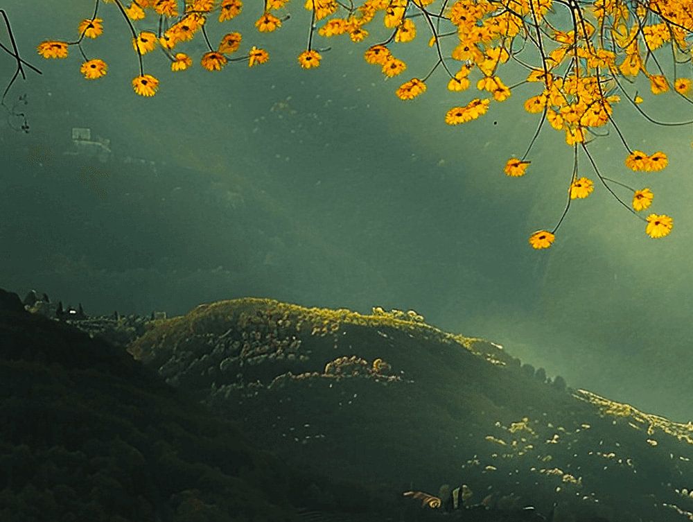 Le cadre semble être une fenêtre sur un monde idyllique et automnal, où la luminosité des fleurs jaunes offre un contraste chaleureux et invitant avec l'environnement naturel. Le ciel sombre de l'orage qui approche illustre parfaitement le contraste entre la chaleur des fleurs et l'imminence du malheur.
