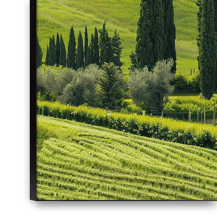 L'œuvre d'art représente une ferme toscane traditionnelle entourée de champs verdoyants et de cyprès majestueux. Les couleurs chaudes et le rendu détaillé du paysage donnent vie au charme serein et intemporel de la Toscane. Cette décoration murale s'intègre parfaitement dans n'importe quelle pièce, qu'il s'agisse d'un salon, d'une…