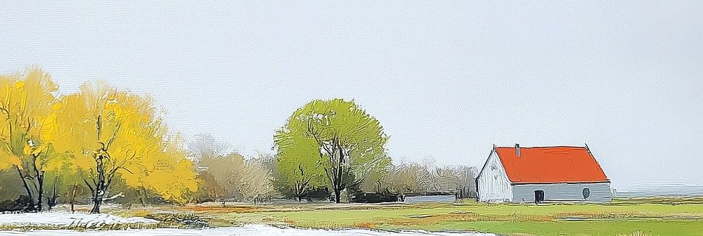Boerderij - Dit schilderij opent met een opvallend, bijna spottend rood dak dat je blik meteen naar rechts trekt, alsof het dak een klein signaalhuisje op de uitgestrekte vlakte is. Het rode dak staat op een koel wit huis — een boerderij — strak en helder tegen een ruime, sobere lucht. Het contrast tussen het warme, bijna fluorescerende rood en het zachte, matte wit van het huis geeft het tafereel meteen een moderne twist; het is een boerderij schilderij dat tegelijk vertrouwd en ontwapenend fris aanvoelt. De keuze voor dit rode dak werkt als een visuele anker: het markeert de horizon en nodigt uit tot nader kijken naar dit huis schilderij.
