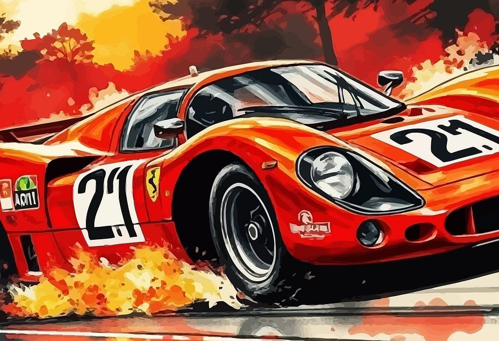 Rien n'est immobile dans cette scène ; tout respire et brûle. Les traînées d'encre, semblables à des flammes, s'enroulent autour de la voiture, mêlant la précision mécanique au chaos de l'émotion. La 330 P4 renaît non pas en tant que métal, mais en tant que mythe - un esprit de vitesse rendu en mouvement pur. Cette peinture rayonne de vitalité et d'émerveillement, parfaite pour les collectionneurs qui recherchent un art qui brûle de vie et défie le silence.