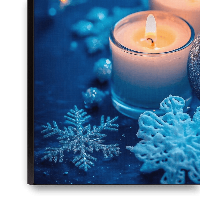 À la douce lumière des bougies scintillantes se déploie un paysage hivernal de rêve fait de boules bleues scintillantes et de flocons de neige étincelants. Cette composition harmonieuse crée une ambiance de recueillement, parfaite pour le salon où la convivialité et la magie de Noël s'unissent avec élégance. La palette de couleurs…