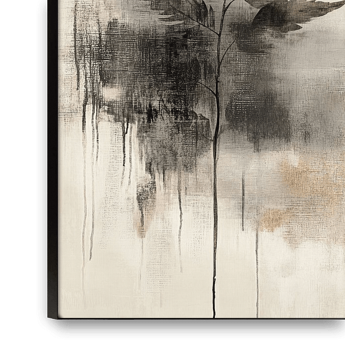 Autumn Leaf | Soft Whispers of Autumn - Cette peinture florale montre une élégante composition de feuilles et de branches dans des tons de terre, flottant sur un fond abstrait de gris, de beige et de blanc avec de subtils accents dorés.