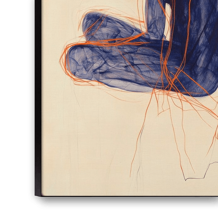Un silence mélancolique flotte autour de la figure contemplative, enveloppée de lignes douces et fluides dans des tons bleus et orangés profonds. Cette composition harmonieuse dégage une impression de calme et de réflexion, parfaite pour une chambre à coucher ou un espace méditatif, afin de favoriser une atmosphère de détente et d'introspection.