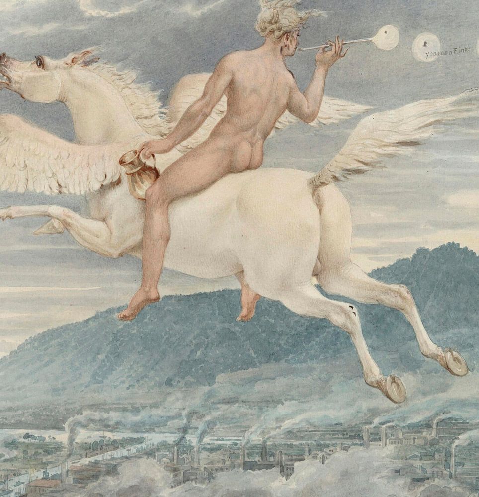Figure féminine (soufflant des bulles), allégorie de Christian Peter Wilhelm Beuth, chevauchant Pégase au-dessus d'une ville industrielle, Karl Friedrich Schinkel L'arrière-plan de ce tableau est formé d'un vaste paysage industriel, parsemé de formes carrées et trapues d'usines, de hauts fourneaux et de cheminées fumantes, et entrecoupé par un canal très fréquenté qui sert de lien avec le fleuve. Au premier plan, nous discernons une image totalement différente, émergeant d'une ouverture en forme d'entonnoir. Le regard est dirigé vers un coin du bureau de Beuth, où l'on voit une pile de dossiers contenant les archives de l'Association du commerce et de l'industrie et de l'Association des artistes berlinois. Au-dessus de ce "laboratoire d'idées" flotte une figure féminine assise sur Pégase, qui souffle des bulles en volant. Comme la lumière qui brille dans le bureau de Beuth, la femme symbolise le pouvoir de l'inspiration. Né de cet esprit créatif, le groupe de figures allégoriques semble être soulevé par des courants thermiques, s'élevant sur la chaleur d'en bas - un motif que Schinkel pourrait bien avoir connu du théâtre Pinetti. Sous la direction de Johann Carl Enslen à partir de 1796, ce théâtre a donné lieu à un certain nombre de spectacles comprenant des "actes aérostatiques", dont l'un s'appelait le "Cavalier" sur Pégase (illustré dans Schulze Altcappenberg 2012). L'image que Schinkel se fait de Pégase est donc à plusieurs niveaux, employant des thèmes et des motifs qui s'appuient sur une variété de sources historiques et culturelles : de la mythologie antique aux visualisations de l'avenir, du