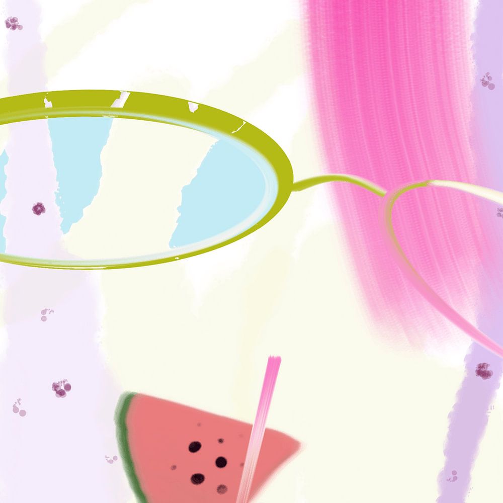 Achetez cette œuvre d'art abstraite Fille aux cheveux roses avec des lunettes de soleil vertes et un cocktail de melons par Csilla Albert sur toile, aluminium, ArtFrame ou photographie (encadrée), impression d'art en haute qualité et tout format.