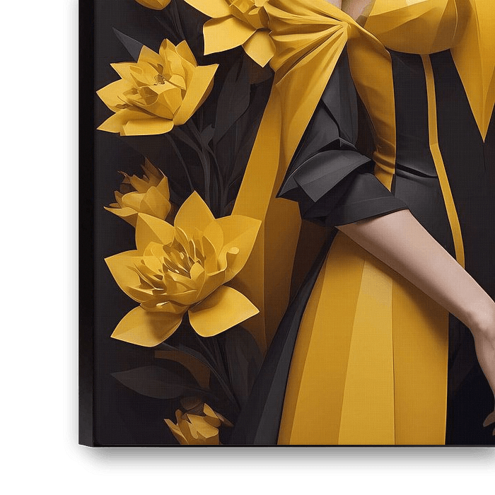 Acheter ce art numérique Fille renard floral low poly, noir et jaune par 1x Merch sur toile, aluminium, ArtFrame ou photographie (encadrée), impression d'art en haute définition et tout type de format.