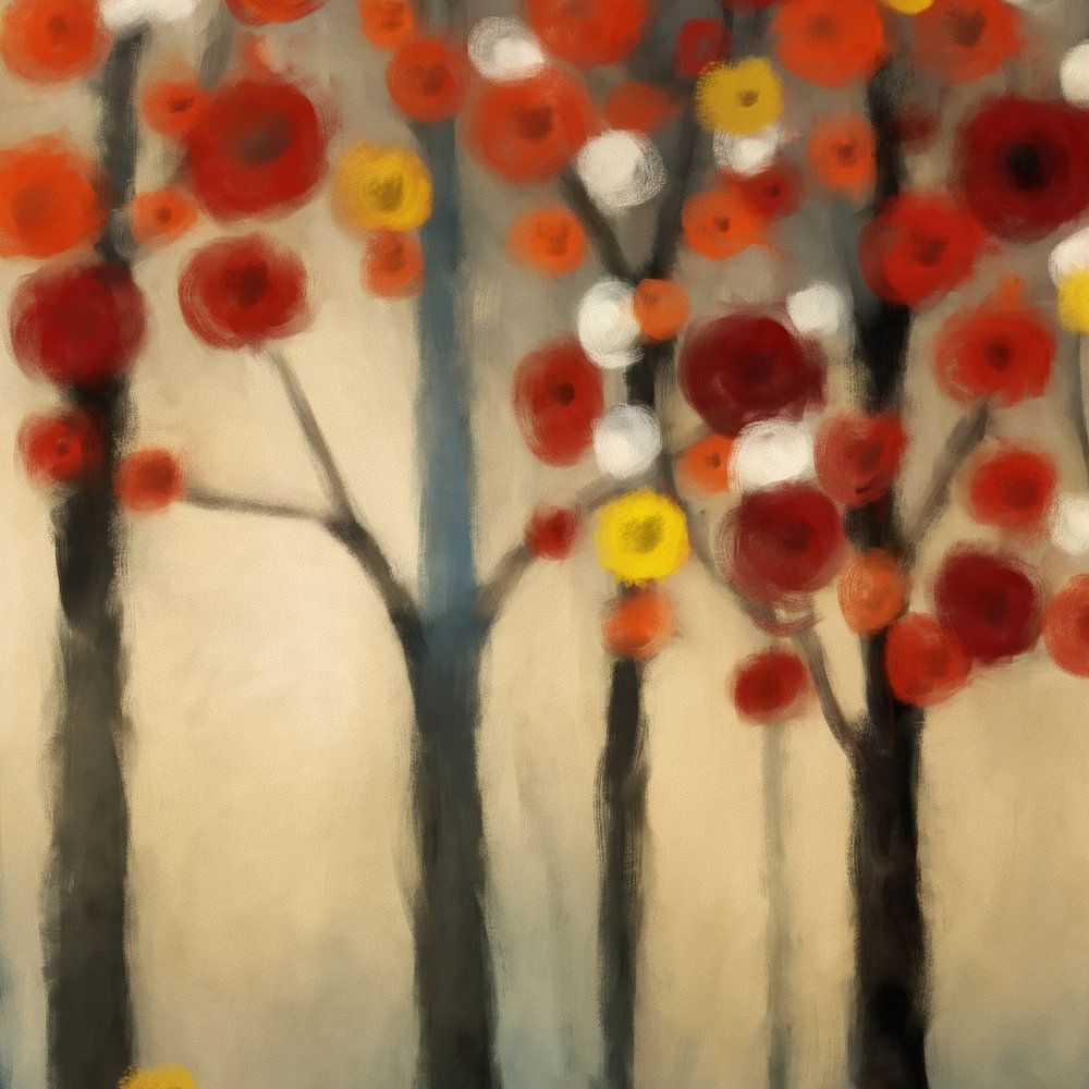 Une représentation stylisée d'arbres avec des fleurs rondes et colorées, rouges et blanches, sur un fond dégradé, crée une scène de forêt fantaisiste. La disposition et la palette de couleurs donnent à cette scène un air de rêve, presque d'un autre monde.