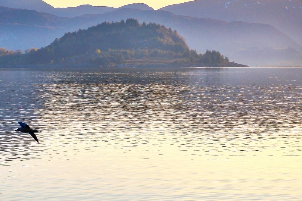 Fjord en Norvège. Fjord et mer au coucher du soleil avec des montagnes sur la côte. Nature rude en Scandinavie