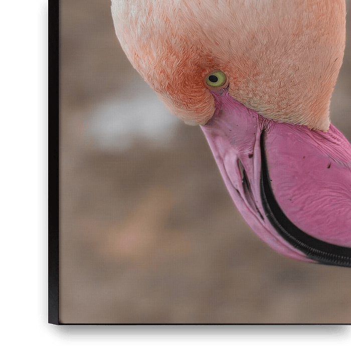 Les doux tons rose pastel du plumage contrastent subtilement avec les roses et noirs éclatants du bec, tandis que l'arrière-plan calme et uniforme concentre toute l'attention sur l'animal gracieux.