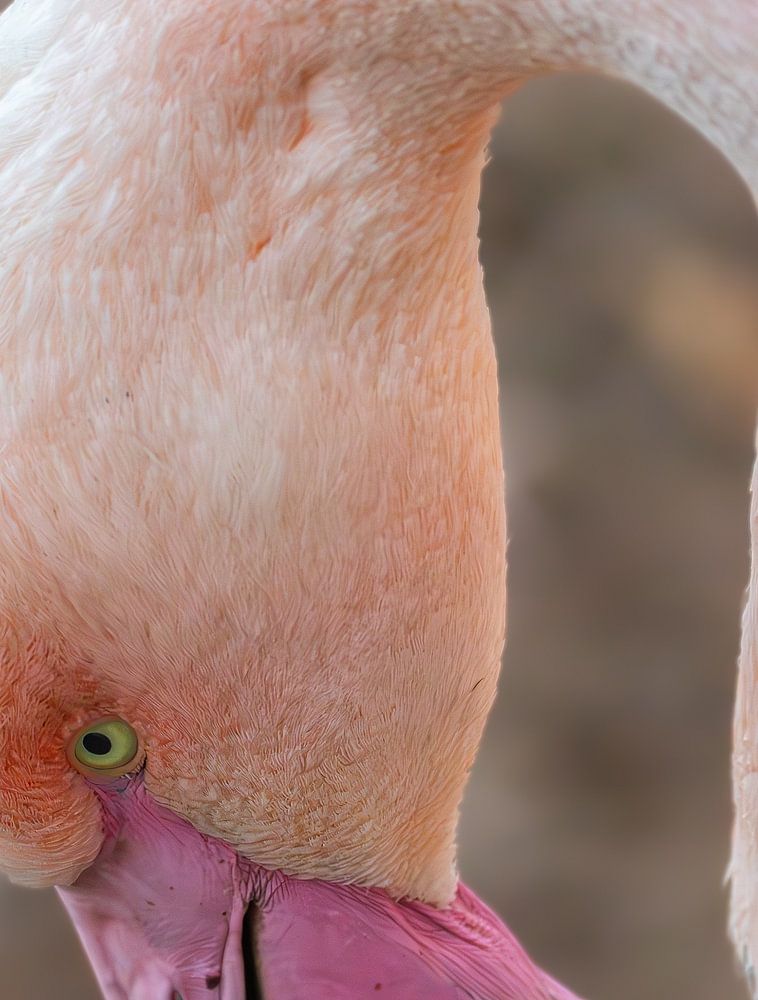 Ce magnifique gros plan montre un gracieux flamant rose qui plie son cou en une forme élégante, presque sculpturale.