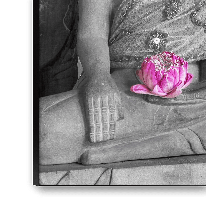 Entre les pierres érodées d'Angkor Wat, le Bouddha est assis dans une dignité silencieuse, comme s'il écoutait le souffle des siècles. La robe dorée qui enveloppe ses épaules scintille comme la lumière du soleil emmagasinée, comme si le matin lui-même s'était transformé en tissu. Devant lui repose une fleur de lotus ouverte, délicate et éphémère, et pourtant pleine de force - un symbole de l'éveil de la boue du monde vers la pure lumière de l'esprit.