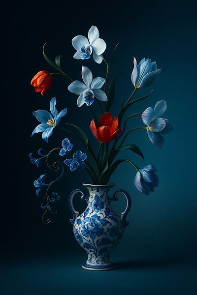 Une élégante nature morte avec des fleurs bleues et rouges dans un vase classique bleu Delft, sur un fond sombre et profond. Élégante, calme et intemporelle.