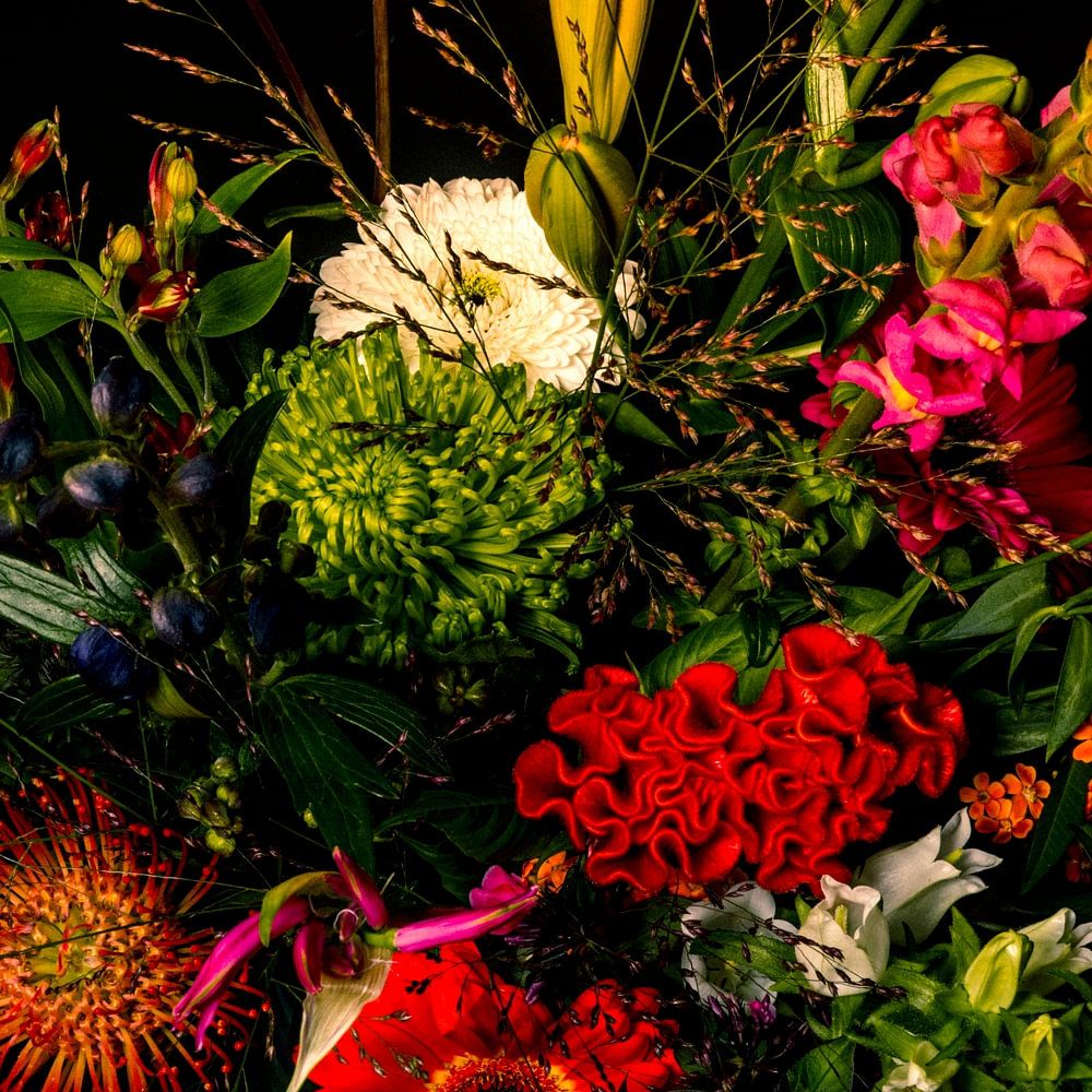 Bouquet de fleurs colorées sur fond noir à l'aspect vintage. Avec un clin d'œil aux peintures des anciens maîtres d'antan.