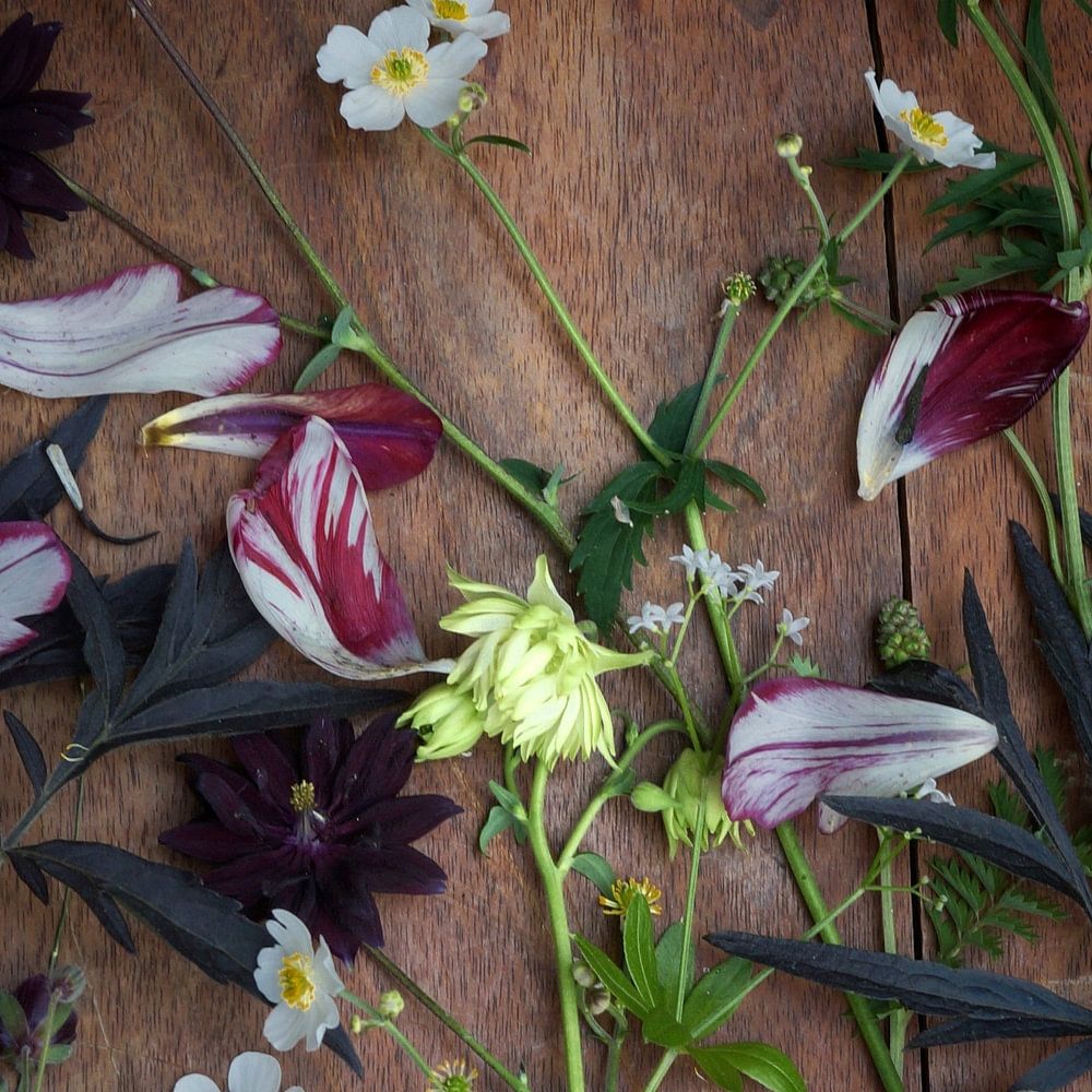 Une collection de fleurs cueillies dans le jardin sur du bois - pétales de tulipe, aquilegia, feuilles de sureau.