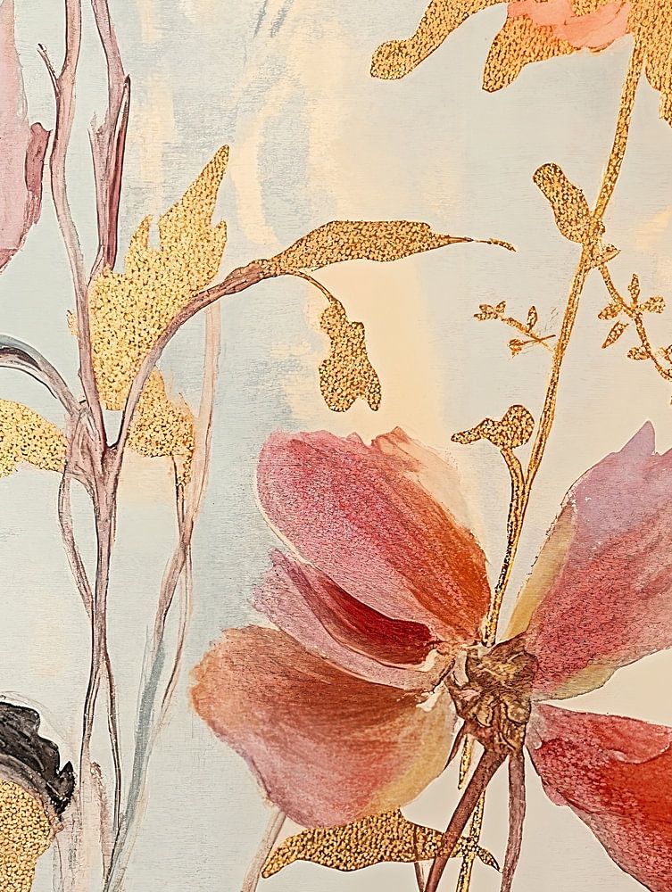 Fleurs d'or | Danse des pétales d'or - Cette peinture de fleurs représente de délicates fleurs roses et dorées sur un doux fond bleu, les fleurs étant élégamment étirées et détaillées avec des reflets dorés.