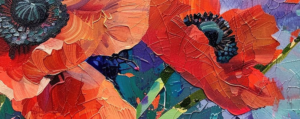 Fleurs de coquelicots | Coquelicots dans le jardin - Cette peinture de fleurs montre des coquelicots rouge vif avec un centre noir frappant, au milieu d'un arrière-plan coloré plein de bleus et de verts, ce qui lui confère une touche moderne et vibrante pour le jardin.