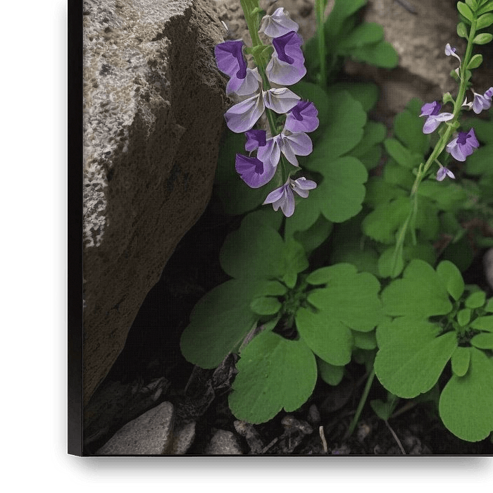 Cette image montre une délicate touffe de fleurs sauvages violettes et blanches poussant au milieu d'un sol forestier rocheux, humide et ombragé. Au premier plan, on peut voir une seule tige florale qui s'élève, dont les fleurs lumineuses forment un élégant contraste avec la pierre beige à proximité. En arrière-plan, un flou permet de…