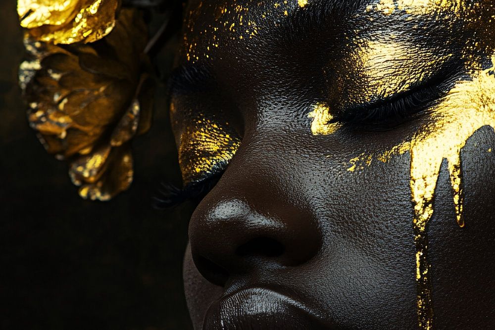 Cette œuvre d'art puissante et intrigante représente un visage féminin à la peau sombre et profonde, subtilement rehaussé d'un effet doré spectaculaire. Les fleurs qui ornent sa tête lui confèrent une élégance naturelle, tandis que la peinture dorée qui dégouline sur son visage évoque un sentiment de sophistication et d'abstraction. La combinaison des tons sombres et dorés crée un fort contraste qui transmet un sentiment de luxe et de mysticisme. Ce motif serait parfait pour attirer le regard dans un intérieur moderne, par exemple dans une chambre à coucher ou une salle à manger, où il ajouterait une touche de flair artistique et de sophistication. Les couleurs audacieuses et les textures frappantes font de cette sculpture un ajout unique et magnifique à tout intérieur contemporain.