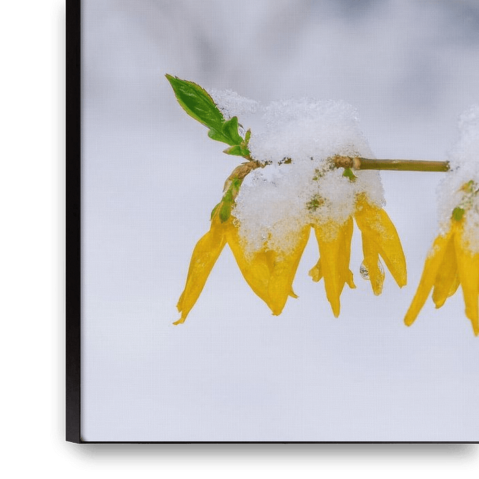 Achetez cette œuvre d'art florale Fleurs recouvertes de neige d'un arbuste de forsythia par ManfredFotos sur toile, aluminium, ArtFrame ou photographie (encadrée), impression d'art en haute qualité et tout format.