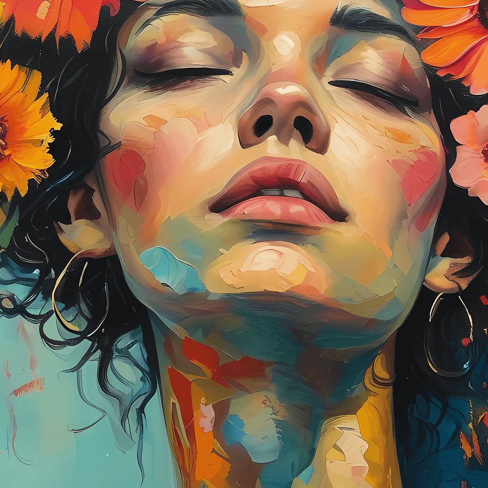 Son visage n'est que vaguement visible, peut-être quelques contours ou ombres suggérant un sourire ou un regard, mais l'accent est mis sur sa connexion avec les fleurs et les couleurs qui l'embrassent. L'arrière-plan est un mélange doux et fluide de teintes qui rehaussent l'éclat des fleurs : un turquoise profond, des rouges rosés chauds et une touche d'or qui accentue la lumière et l'énergie de la femme.