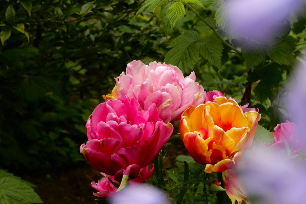 Jardin de devant à Scharn avec des fleurs épanouies aux couleurs vives qui se complètent à merveille.