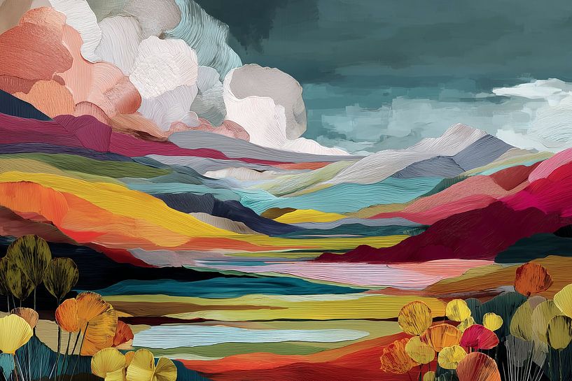 Cette œuvre dépeint un paysage abstrait dans lequel la couleur, le mouvement et la nature s'entremêlent. L'image est composée de multiples couches de couleurs qui se déplacent sur la surface comme des bandes douces et organiques. À la base se trouvent des teintes chaudes et froides - jaune, vert, rouge, orange, rose, violet et gris -…