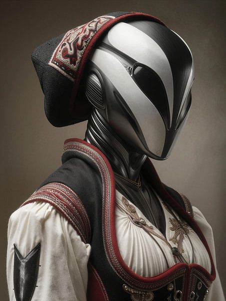 Ce travail montre un personnage dont l'identité s'efface complètement derrière la forme, le matériau et l'attitude. Le visage n'est plus humain, mais réduit à une surface lisse, semblable à un masque. Pas d'yeux, pas de bouche, pas d'émotion - seulement des lignes, des transitions et une structure fermée. L'absence d'expressions faciales crée à la fois une distance et une concentration. Le regard du spectateur ne trouve pas d'appui, mais glisse sur la surface.