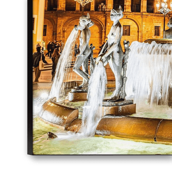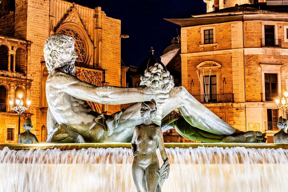 Photo nocturne de la fontaine Turia avec Neptune dans la vieille ville de Valence Espagne avec la cathédrale en arrière-plan sur la Plaza de la Virgen