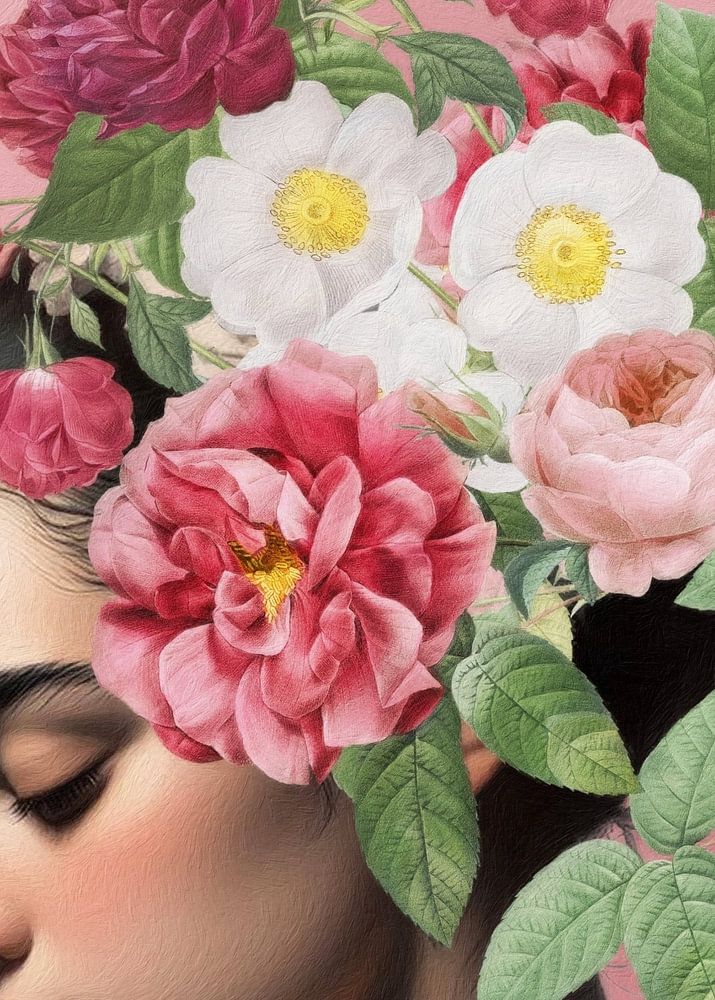 Cette œuvre d'art (un collage d'images) a un fond rose et respire la tranquillité, l'été et la beauté.