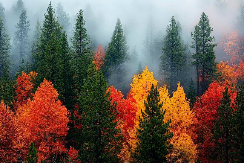 Une forêt enchanteresse aux couleurs automnales éclatantes se déploie, tandis que des nappes de brouillard dansent mystérieusement entre les arbres. Les tons chauds de l'orange et du jaune contrastent de manière impressionnante avec les sapins d'un vert profond. Ce tableau apporte une énergie vivante et une ambiance nature apaisante…