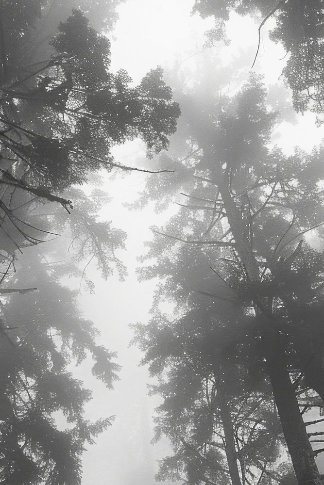 Cette impressionnante image en noir et blanc capture l'atmosphère mystique d'une forêt dense enveloppée de brouillard. Les arbres hauts perchés disparaissent dans l'épaisse couche de brouillard, ce qui crée une ambiance presque surréaliste et mystérieuse. Idéale pour les amateurs de photographie de nature et d'esthétique en noir et blanc, cette œuvre apporte une atmosphère à la fois calme et mystique dans n'importe quelle pièce.