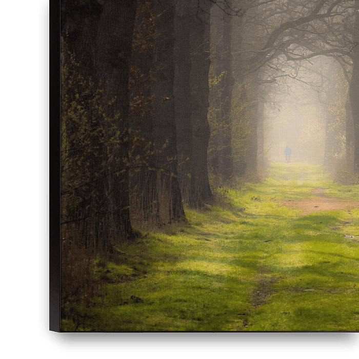 Une forêt de conte de fées. L'humidité de la nuit s'évapore à cause du soleil du début du printemps. Cela crée un petit brouillard au sol dans la forêt. Au loin, on aperçoit un cycliste avec un manteau bleu. Les arbres semblent former un tunnel. Le vert frais de l'herbe montre que le printemps arrive vraiment, même si les arbres n'ont…
