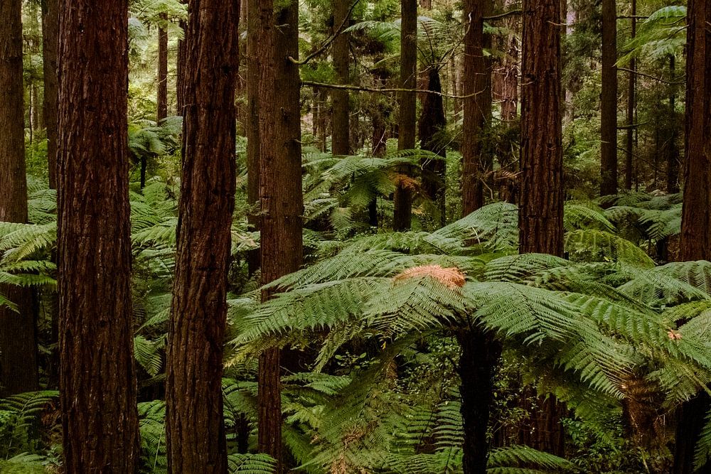 Les séquoias (Sequoioideae) sont surtout connus en Californie, mais on en trouve aussi en Nouvelle-Zélande. Dans cette forêt (Whakarewarewa forest), ils sont loin d'être aussi vieux que ceux de Californie et sont donc un peu plus élancés.