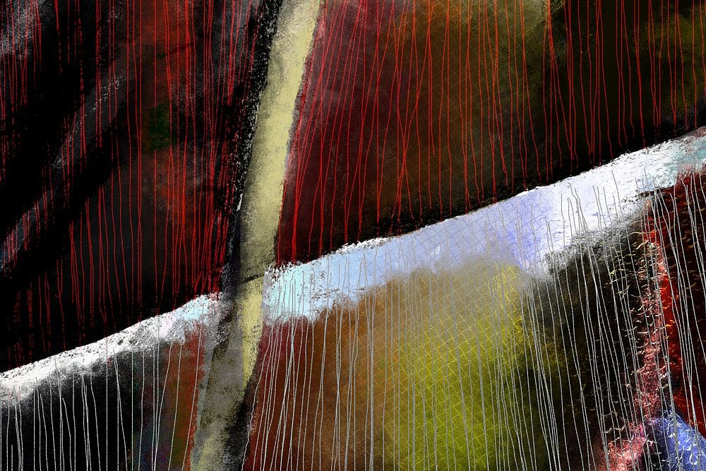 Peinture numérique abstraite avec des formes complexes ressemblant à des paysages, dans une palette de couleurs vives, créant un paysage captivant.