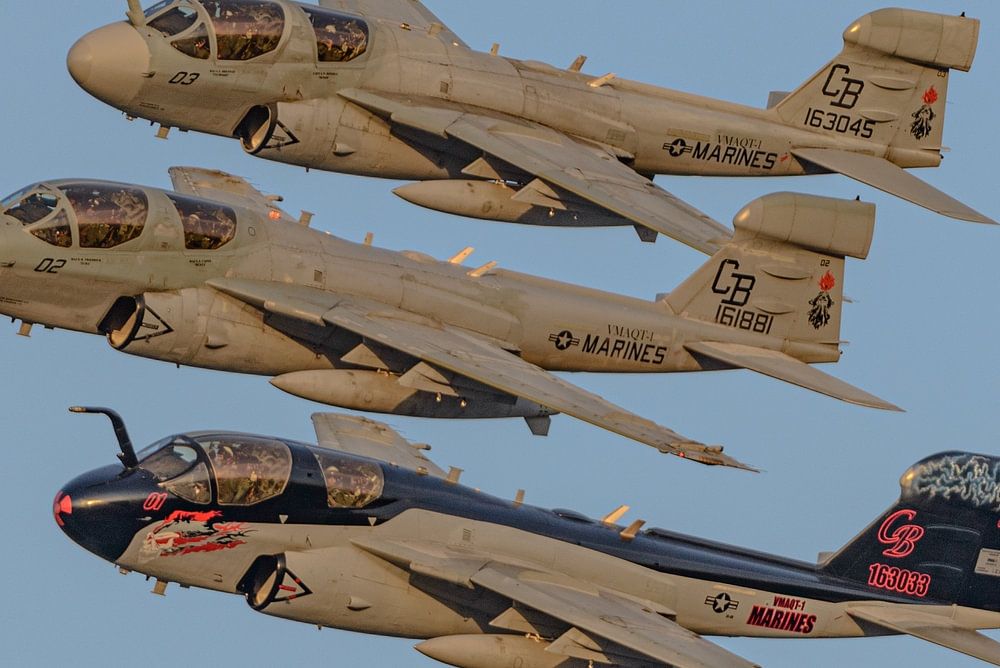 Formation de 3 Grumman EA-6B Prowlers lors d'une cérémonie d'adieu au MCAS Cherry Point. Photo prise à la fin du mois d'avril 2016.