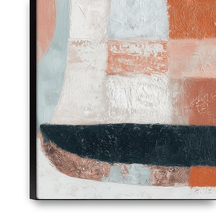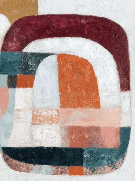 Abstrait contemporain avec des arches empilées et des blocs géométriques dans les tons bordeaux, orange brûlé, bleu sarcelle et rose pâle. La surface texturée de la peinture et les formes arrondies créent une composition architecturale équilibrée.