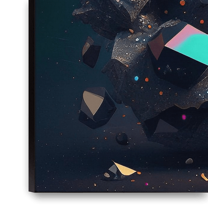 Une éruption explosive de roches déchiquetées et de formes géométriques éclate dans les profondeurs de l'espace et rayonne d'une énergie dynamique. Entouré de fragments vivants et incandescents, le cluster central brille dans des tons orange ardents, dramatiquement sur un fond profond et sombre. Le contraste frappant et la sensation de…
