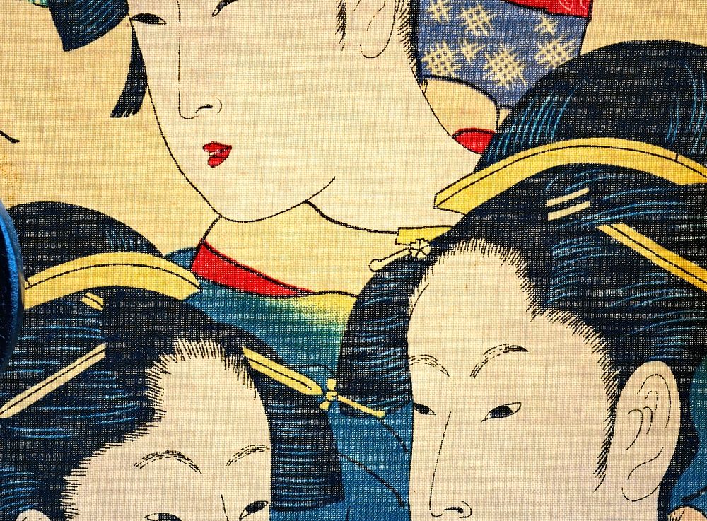 Fragment de lampe ancienne. Visages féminins japonais colorés sur la toile