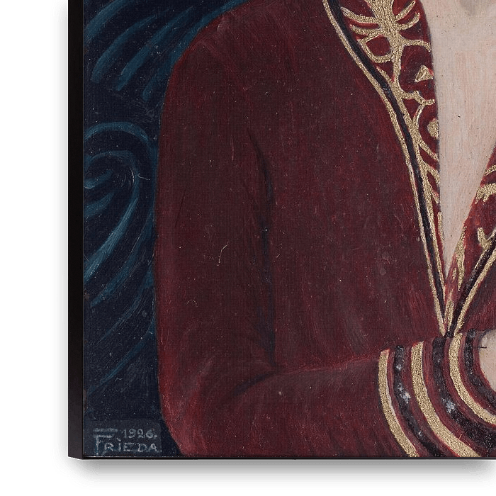 Frida a peint son autoportrait avec une robe de velours en 1926. Cette photographie capture cette œuvre, mais Frida a peint le tableau à l'huile et a copié la peinture. Cet autoportrait, influencé par le travail de Parmigianino ou de Modigliani, est la première œuvre professionnelle de l'artiste. Elle l'a peint pour son petit ami de…