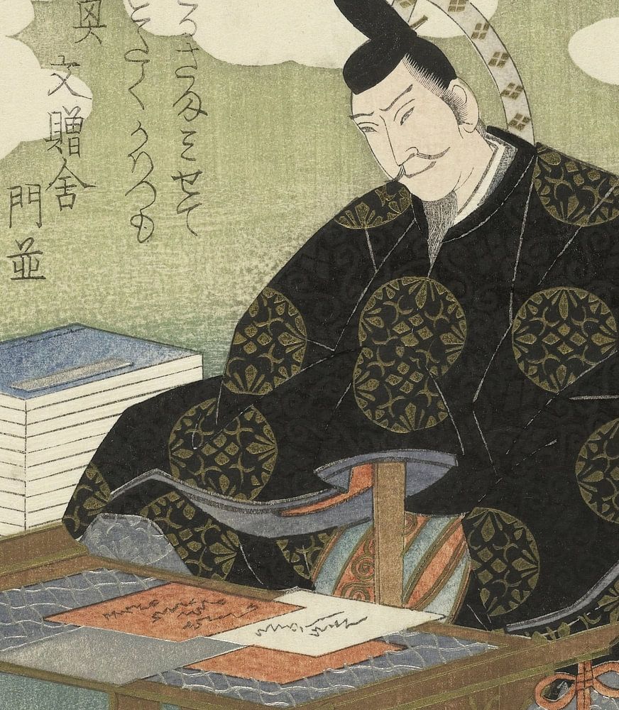 Le poète Fujiwara no Sadaie (1162-1241) à une table d'écriture avec un certain nombre de poèmes (shikishi) devant lui. Avec deux poèmes. Avec deux poèmes. Un surimono est une gravure de luxe dans laquelle une image est combinée avec un ou plusieurs poèmes. Style intérieur Japandi, Zen, Bohème, Rétro Original du Rijksmuseum, Amsterdam