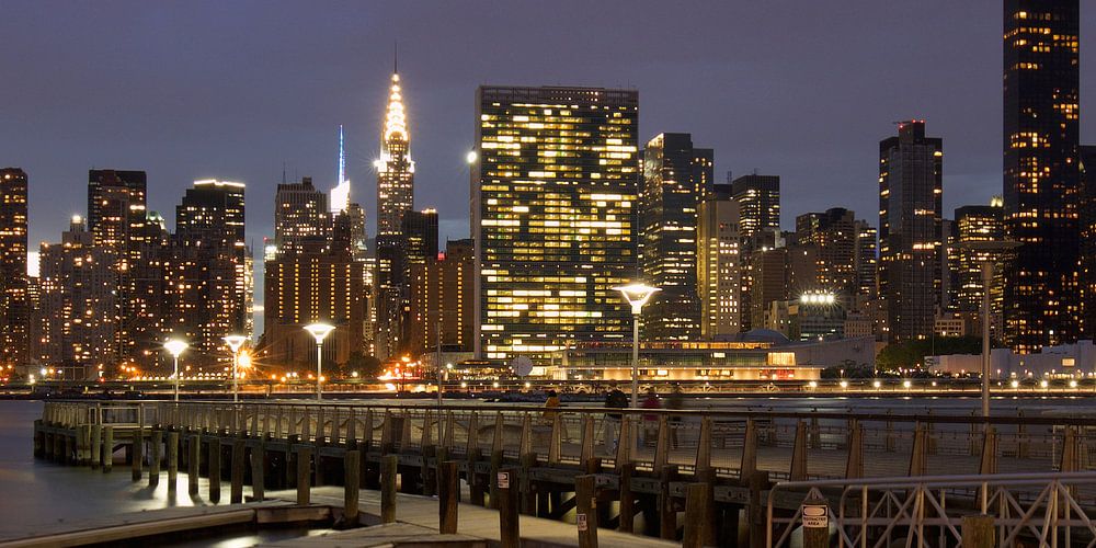 Vanuit dit park aan de East River in New York, kijk je uit over de wolkenkrabbers van Midtown Manhattan.