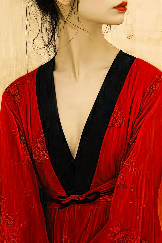 Une Geisha portant un kimono rouge dans un portrait traditionnel japonais de profil 3/4. L'œuvre a été réalisée en technique mixte avec de l'encre et de l'aquarelle sur papier dans le style de Tsuguharu Foujita.