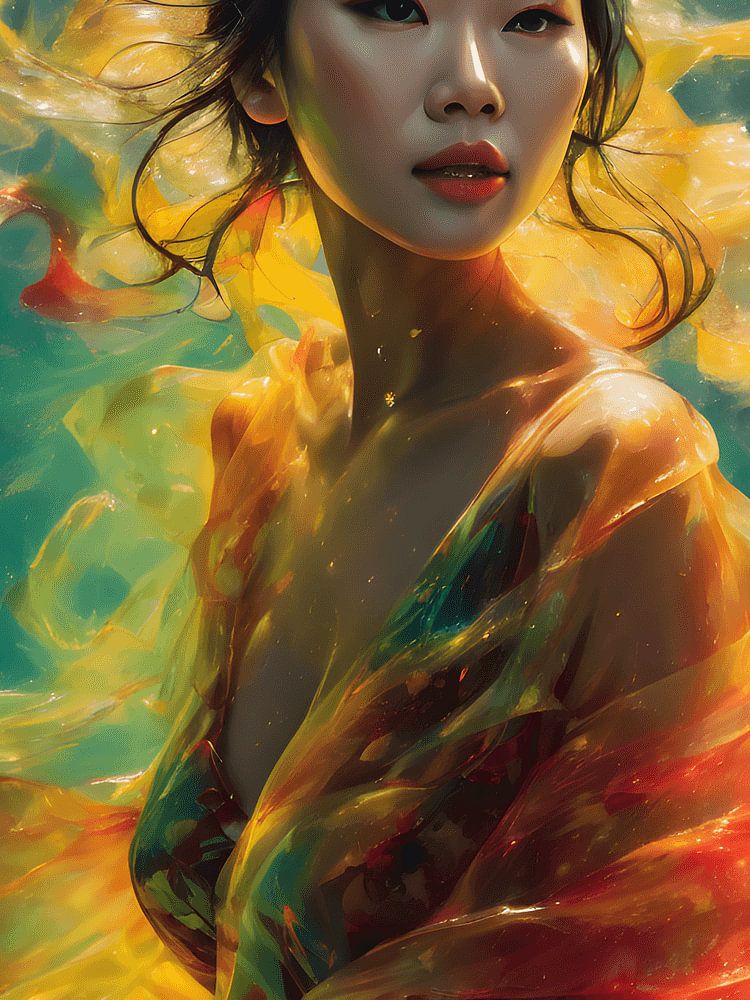 Sa robe se déplace gracieusement dans l'eau, incarnant la puissance et la grâce d'un mouvement gracieux. Cette œuvre capture la beauté artistique d'une geisha japonaise, dans laquelle la couleur et le mouvement semblent prendre vie. Dans cette œuvre d'art, le mouvement, la couleur et la beauté s'unissent.