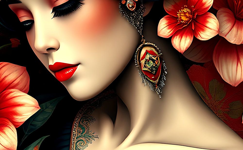 Photo pittoresque d'une geisha orientale sensuelle et fictive avec des fleurs. Détails fins et couleurs vives.