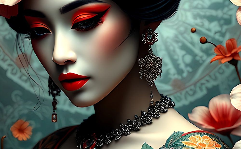 Photo pittoresque d'une geisha orientale sensuelle et fictive avec des fleurs. Détails fins et couleurs vives.