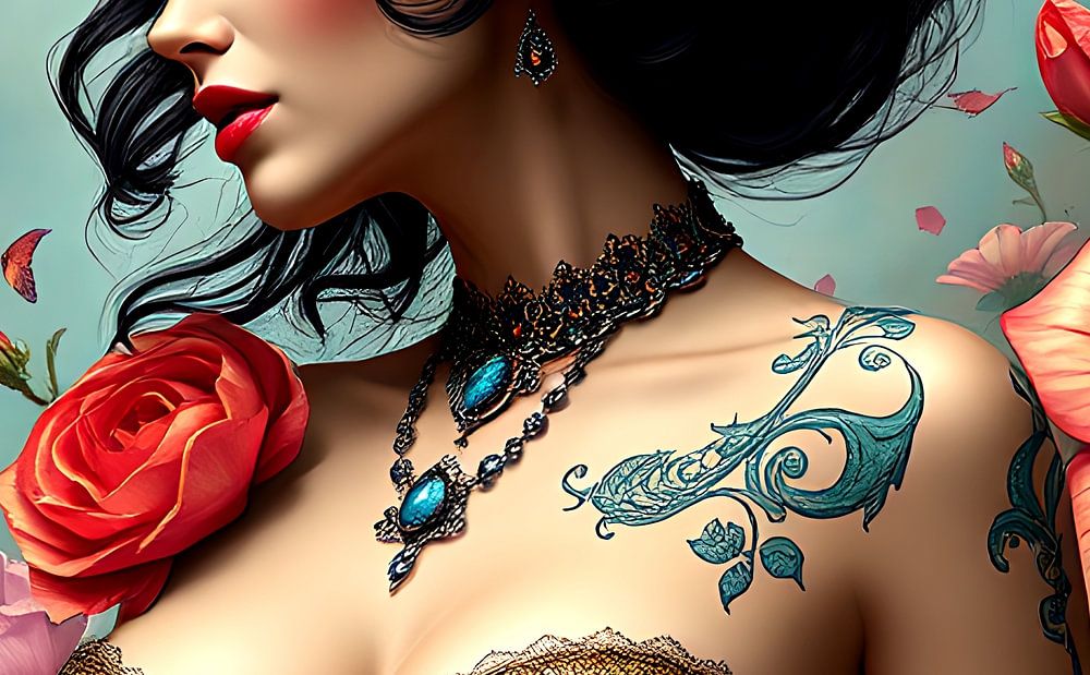 Photo pittoresque d'une geisha orientale sensuelle et fictive avec des fleurs. Détails fins et couleurs vives.