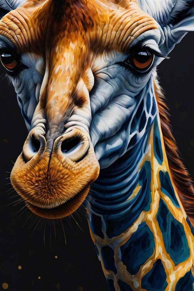 Découvrez le monde enchanteur des portraits d'animaux avec notre dernière nouveauté : une peinture colorée et détaillée d'une girafe. Capturant le regard serein de la girafe sur un ciel nocturne éclairé par des étoiles scintillantes, cette œuvre d'art associe la nature sauvage à une vision cosmique. Les motifs bleus et orange de la peau de la girafe sont exécutés avec une précision étonnante, ce qui en fait une pièce remarquable pour tout espace de vie ou de travail moderne. L'artiste a développé un langage visuel unique qui unit la nature et l'imagination, idéal pour ceux qui souhaitent enrichir leur environnement d'une touche d'élégance et d'insolite.