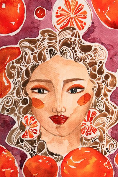 Cette œuvre d'art montre le visage d'une jeune fille entourée d'oranges lumineuses et combine l'art du portrait avec des éléments modernes de nature morte. Les traits doux de la jeune fille contrastent avec les couleurs claires et juteuses des agrumes, créant ainsi un équilibre entre les couleurs chaudes et l'émotion délicate. La…